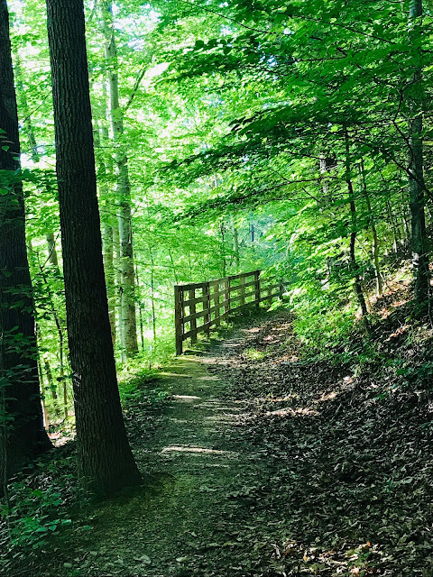 Then we went for another hike before dinner, a short one, the Moss Ridge Trail, which was supposed to be a mile, but I swear it was more - PLUS - it was only 6 p.m. and thus still sunny, but again, once you get into the woods in the mountains of Kentucky, you'd think it was 9 p.m., there's very little light, so we decided to turn around for fear of black bears prowling in the dark, rooting through the rooted up trees.